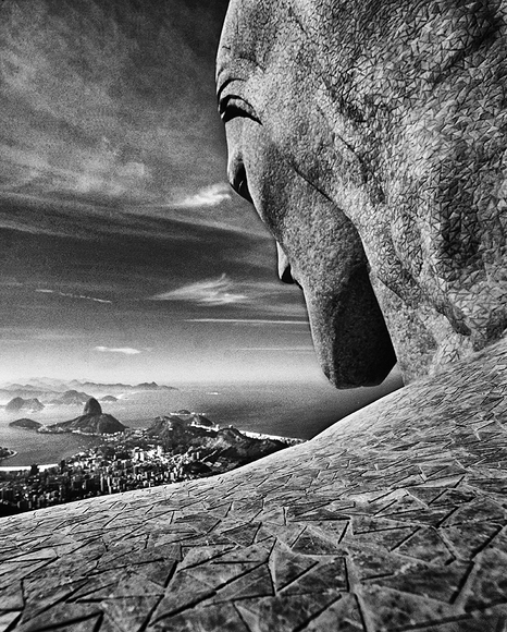 Using film, this image is a rare aerial view of Rio de Janeiro from the shoulders of Christ Redemeer's statue at Corcovado Mountain, in Brazil.