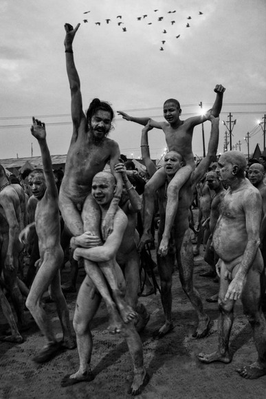 Naga Sadhus (Naked Holy Men) rejoice after taking the holy dip at Kumbh Mela