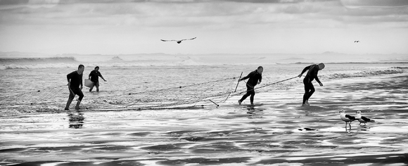 A family group collects food from the sea, Oreti Beach, Aotearoa.