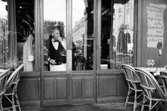 A waiter at a Paris bistro anticipates the noon lunch crush.